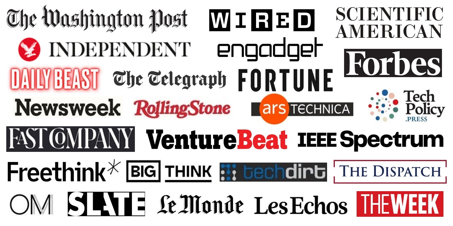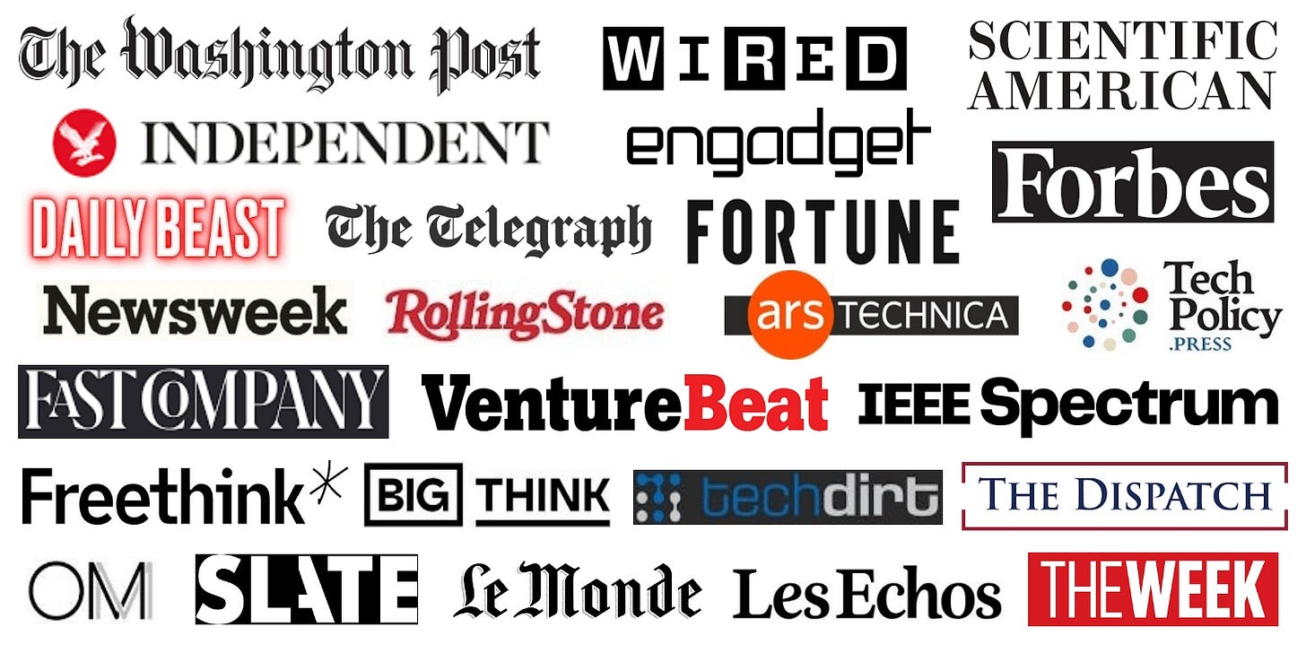 I’ve published in Techdirt, The Daily Beast, FreeThink magazine, Newsweek, Big Think, and Tech Policy Press. I was quoted in The Washington Post, WIRED, Forbes, Fortune magazine, VentureBeat, Engadget, Ars Technica, Slate, Fast Company, Rolling Stone, The Independent, The Telegraph, Le Monde, the Financial Times, IEEE Spectrum, and Scientific American.