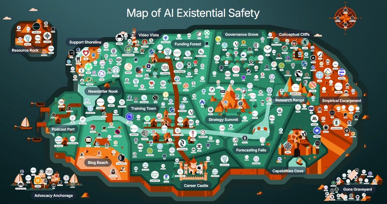 It is a visual overview of the key organizations, programs, and projects operating in the “AI existential risk” ecosystem.
