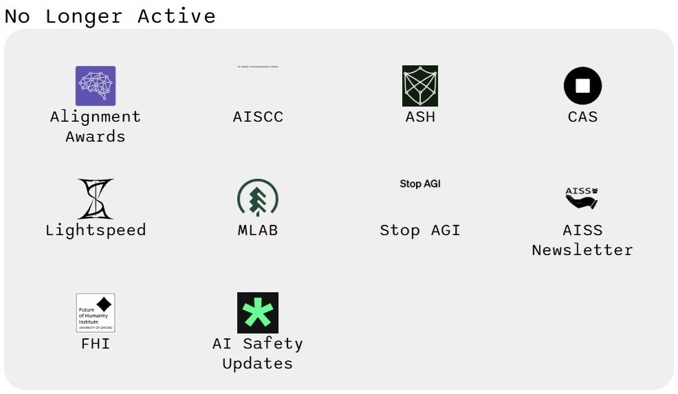 The criteria for inclusion in the map: “An entry must have reducing AI existential risk as a goal; have produced at least one output to that end; must additionally still be active and expected to produce more outputs.”